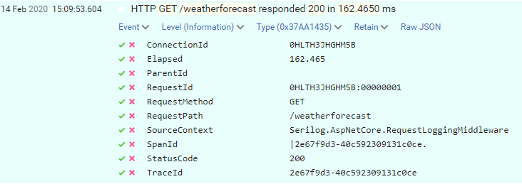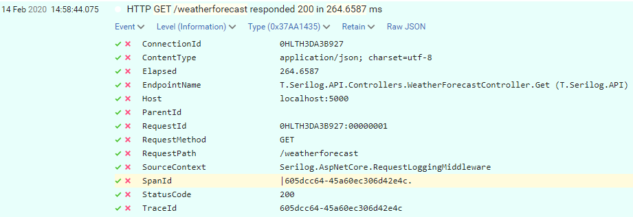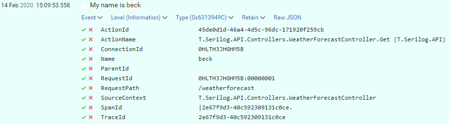 在 Seq 中查看日志如下,已包含添加的扩展属性: