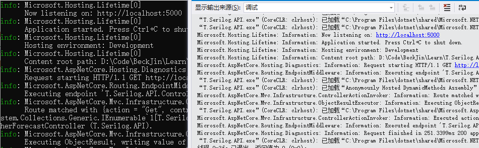 在使用 Serilog 之前我们先看看 .NET Core API 项目默认的日志输出行为。创建基于 .NET Core 3.1 的 API 项目后启动,默认访问会 weatherforecast 接口,然后可以从控制台和调试窗口看到如下输出日志 (.NET Core API 项目模板默认集成了 Console 和 Debug 日志记录器):