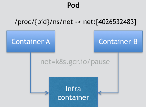 Pod 从表现上来看更像一台虚拟机,容器则是运行在这台虚拟机中的一个个程序进程,如下图(Infra 容器是 Pod 实现中使用的一个中间容器):