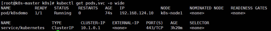 以上两种方式任选一种进行测试即可(以下截图是基于 hostNetwork 方式),修改后重启 Pod kubectl apply --force -f k8sdemo-pod.yaml,然后通过 kubectl get pods,svc -o wide 查看 Pod 所在的主机IP。